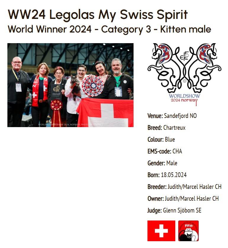 Unser Kater Legolas my Swiss Spirit hat einstimmig gewonnen und darf nun den höchsten Titel der FIFe ; World Winner 2024 (WW24) tragen.